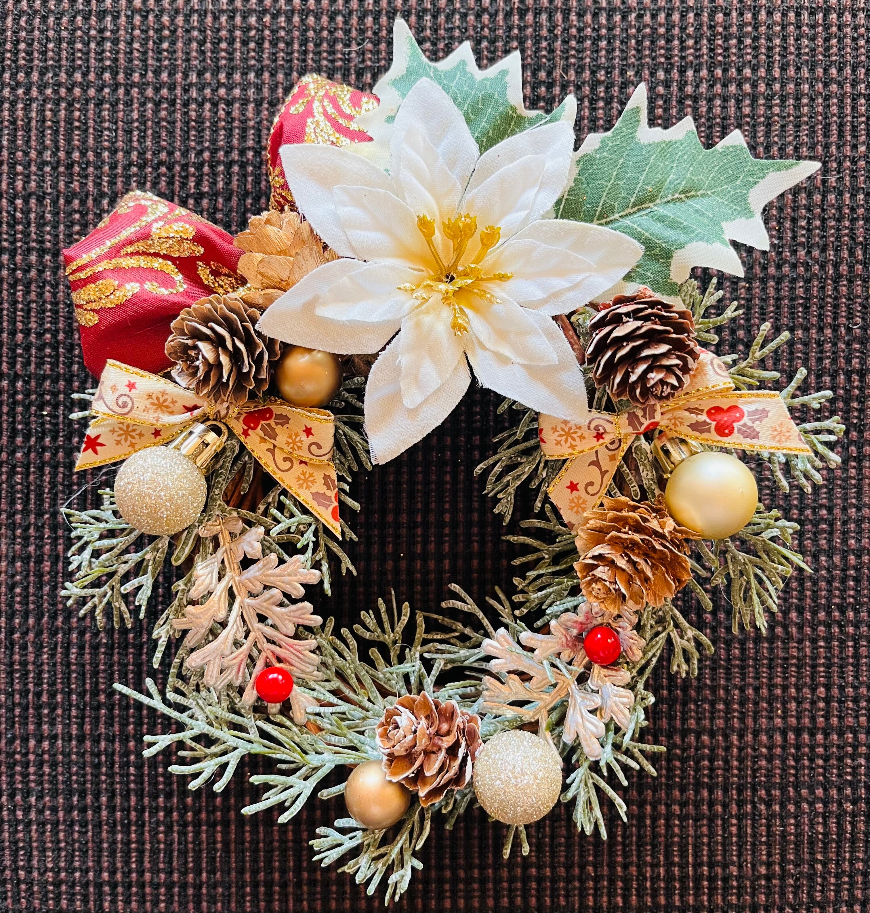 小さめでとても可愛らしいクリスマスリースです☆場所取らないのでとても飾りやすく、ちょっとした空間に最適です〜♪
